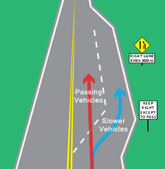 ਇਹ ਹੋਲੀ ਚੱਲਣ ਵਾਲੇ ਵਾਹਨਾਂ ਨੂੰ ਆਗਿਆ ਦਿੰਦੀ ਹੈ ਕਿ ਉਹ ਸੱਜੇ ਹੋ ਕੇ ਇਸ ਲੇਨ ਵਿੱਚ ਆ ਜਾਣ ਤਾਂ ਜੋ ਤੇਜ ਚੱਲਣ ਵਾਲੇ ਵਾਹਨ ਉਹਨਾਂ ਨੂੰ ਖੱਬੇ ਦੀ ਪਾਸ ਕਰ ਸਕਣ |
